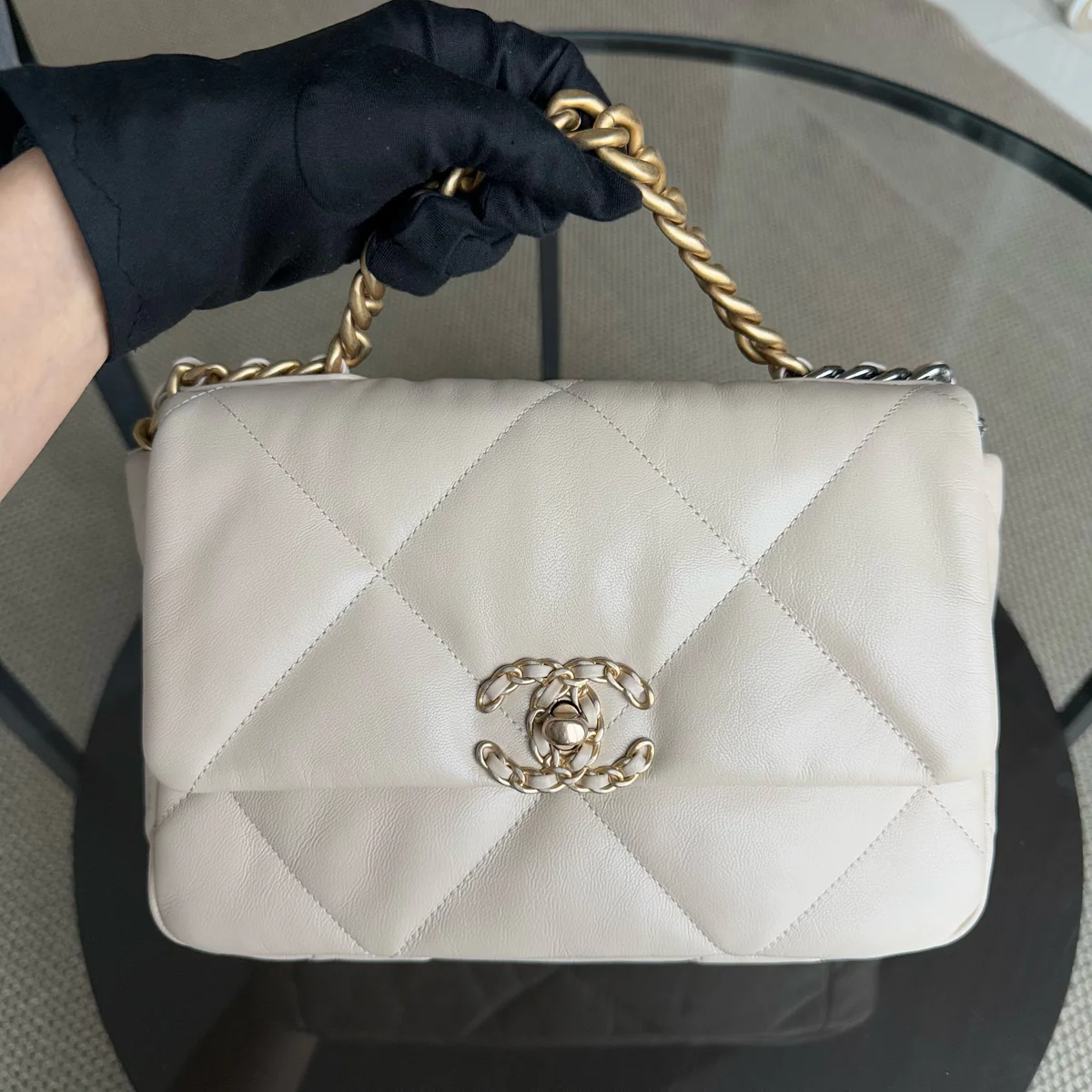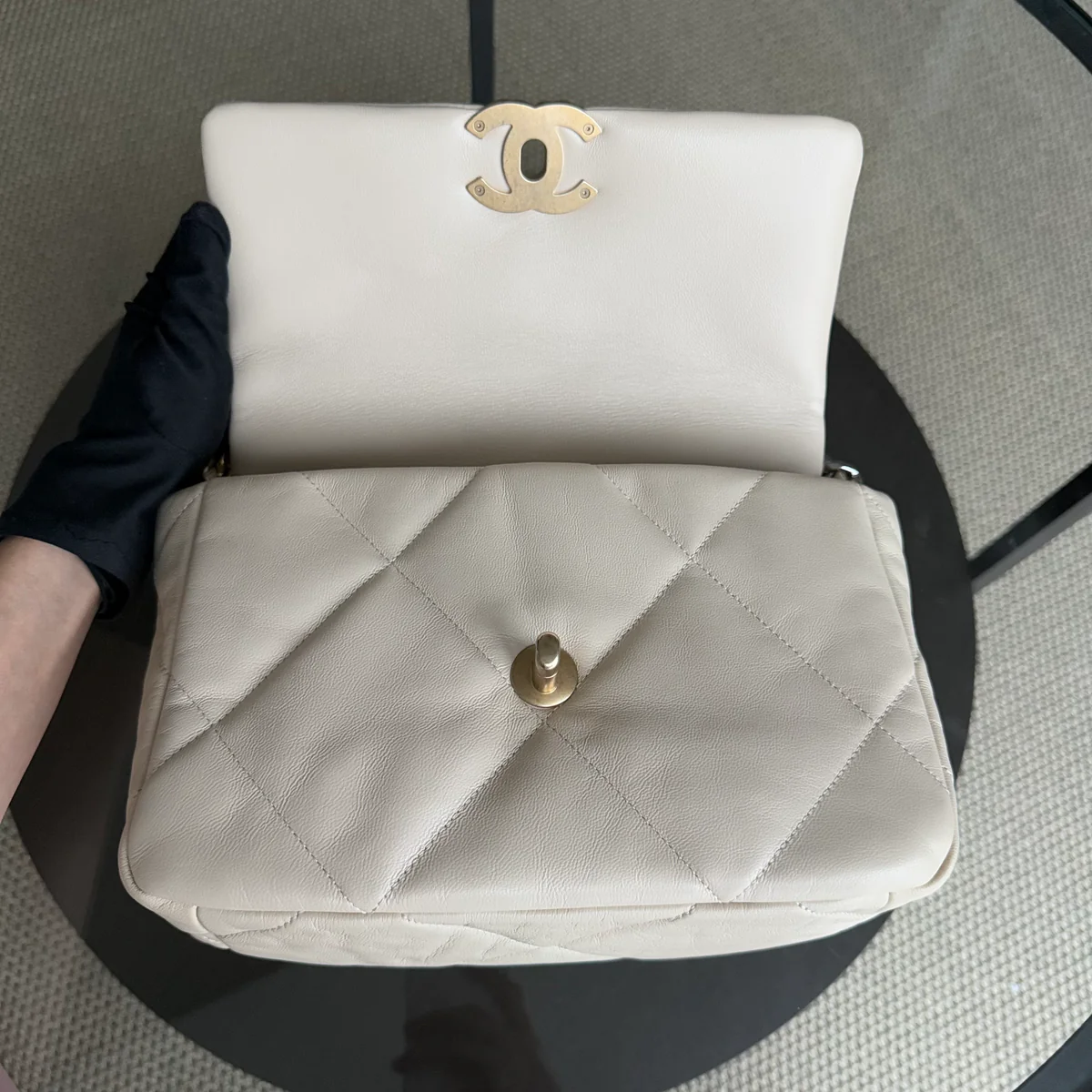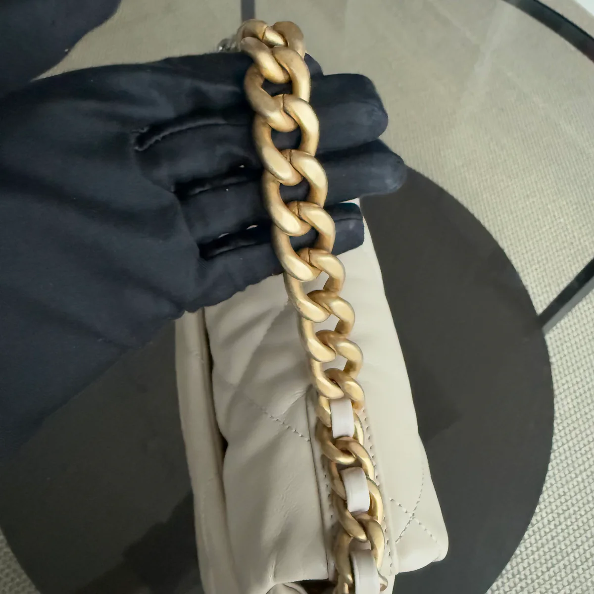 A stunning Chanel 19 Bag in quilted goatskin, this Light Beige beauty is a must-have for any fashion enthusiast.