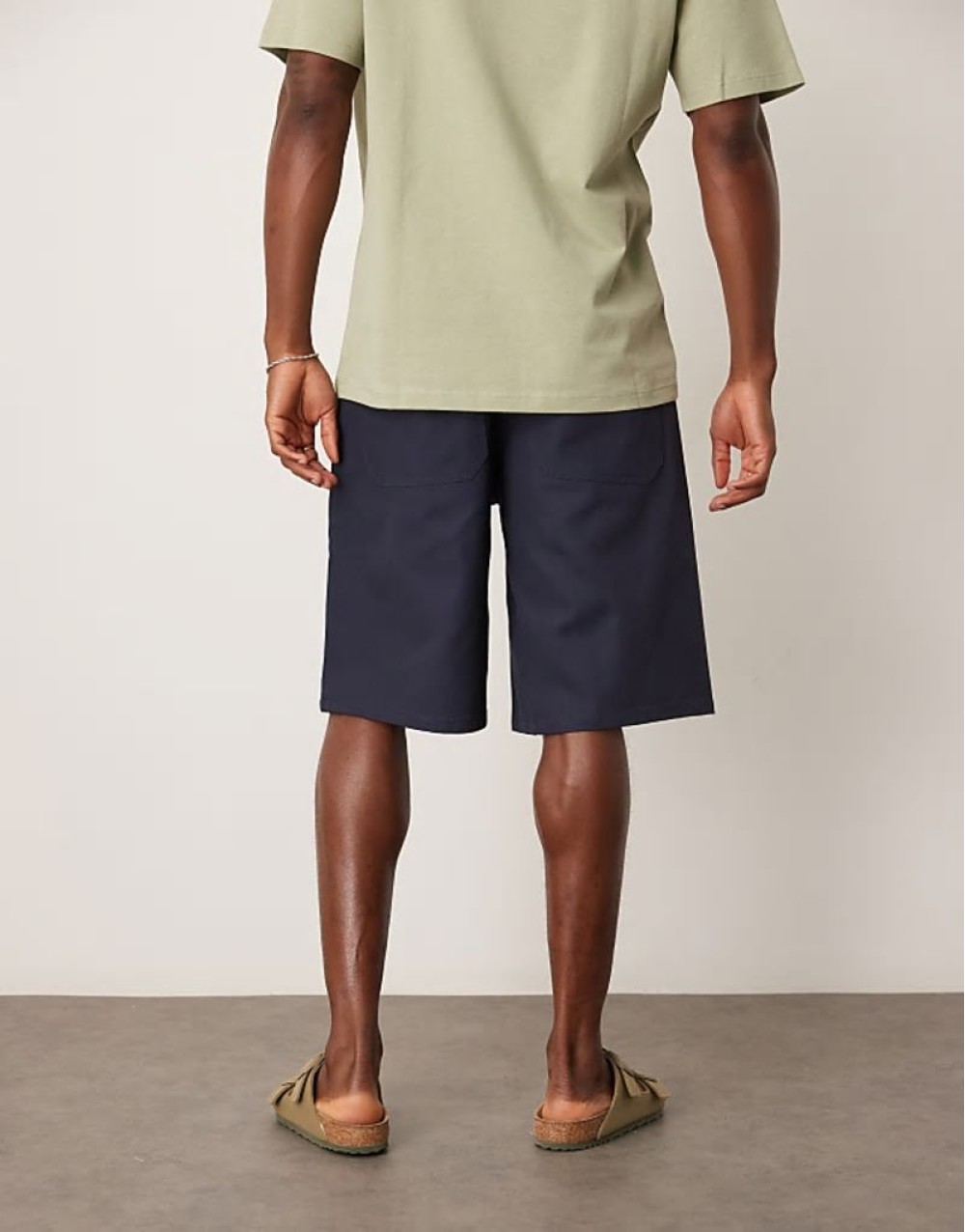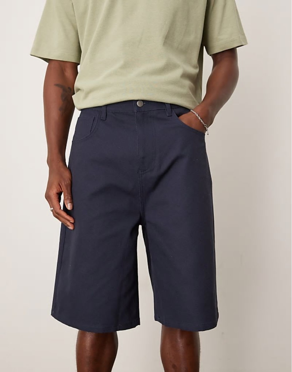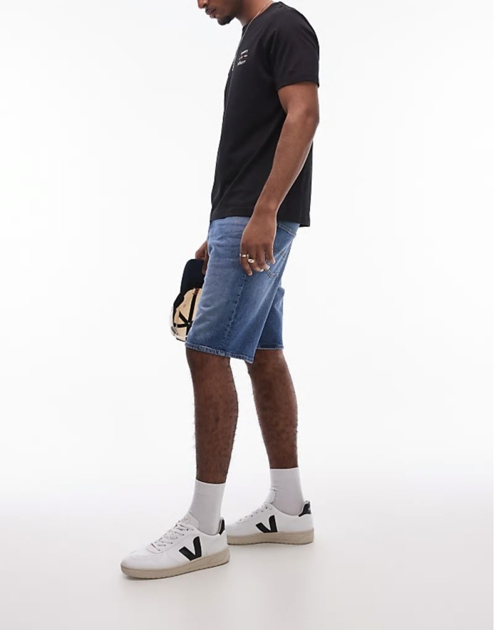 seam detail denim jort with back pocket embroidery in medium washed blue