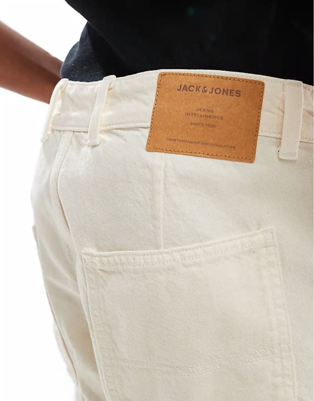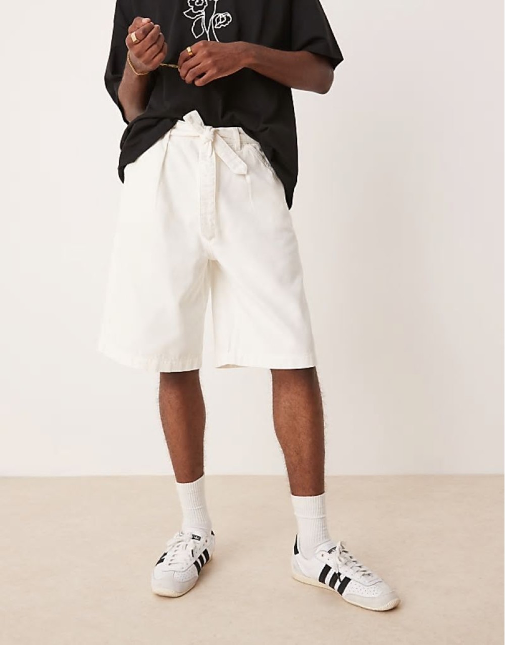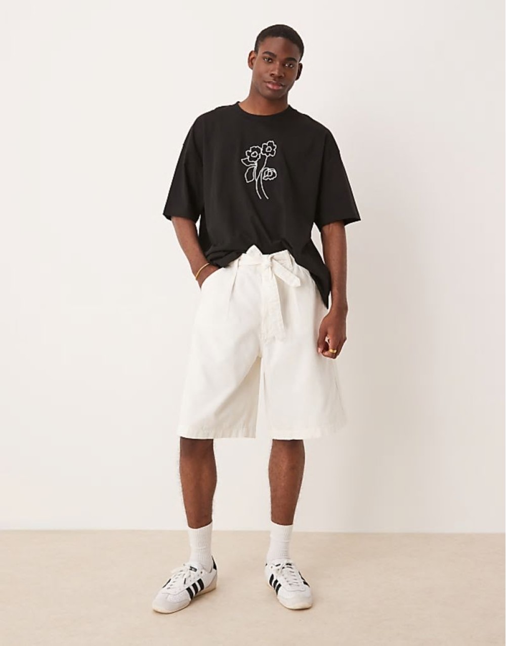 seam detail denim jort with back pocket embroidery in medium washed blue