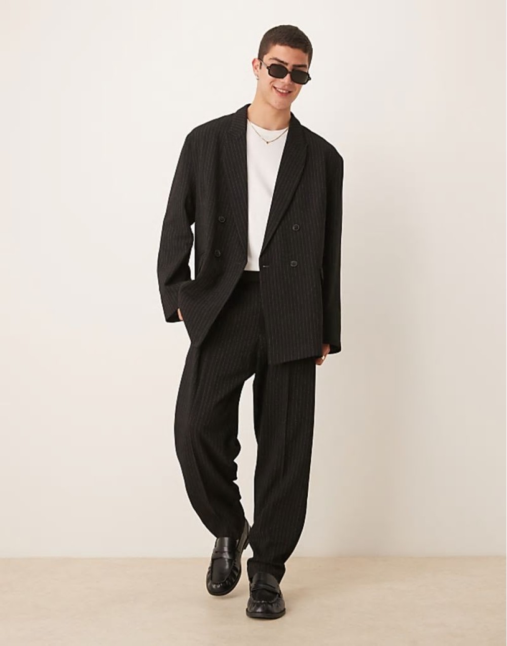 • Comfortable slouchy oversized suit in navy pinstripe